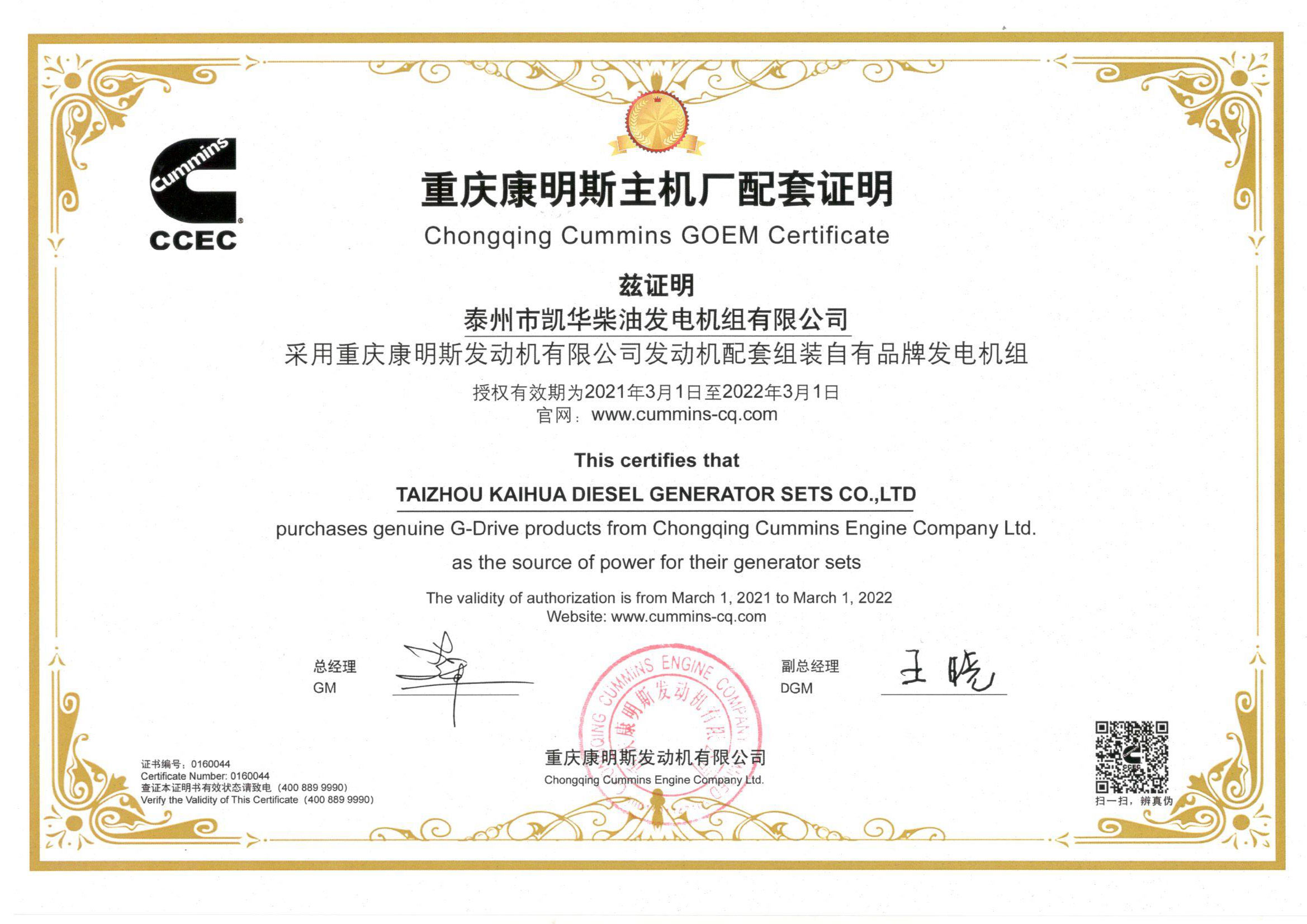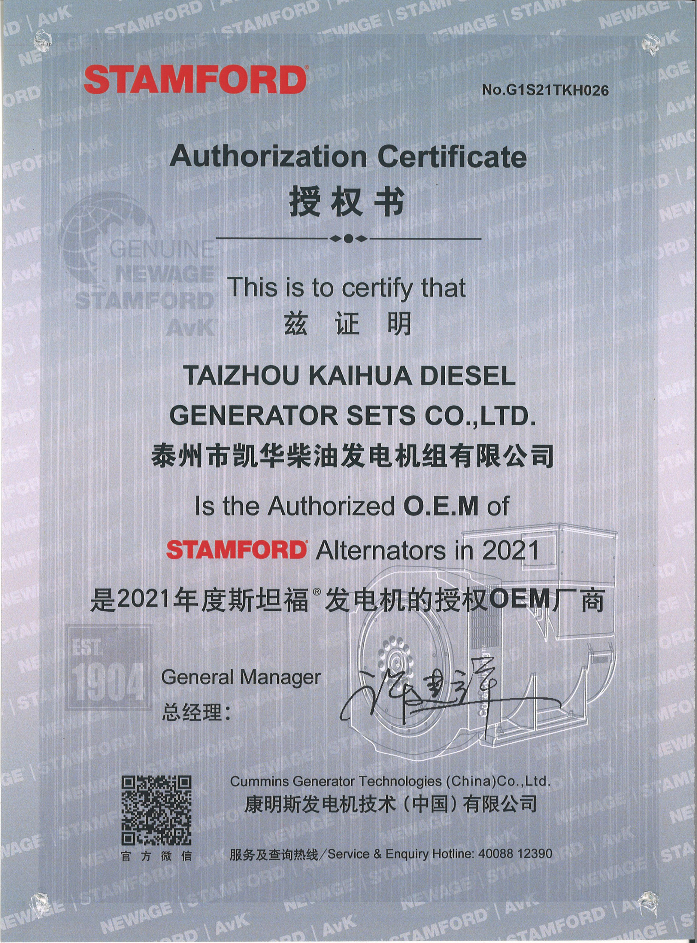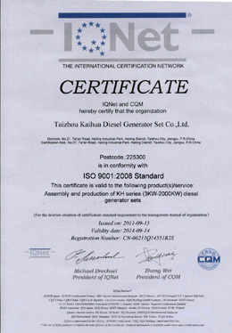 泰州市凱華柴油發電機組有限公司創建于2003年,是一家集柴油發電機組燃氣發電機組的研發、生產、銷售為一體的高新技術民營企業,公司座落于“漢唐古郡,淮海名區”,具有“鳳凰城”美稱的祥泰之州——江蘇省泰州市,地處中國經濟最發達的長三角經濟圈,水陸空立體交通,地理位置十分優越。公司目前注冊資本金11800萬元人民幣,生產基地占地六十畝,現有各類高素質員工一百多名,專業技術人員達46人,其中高級技術人員16人,年銷售額近6億元。